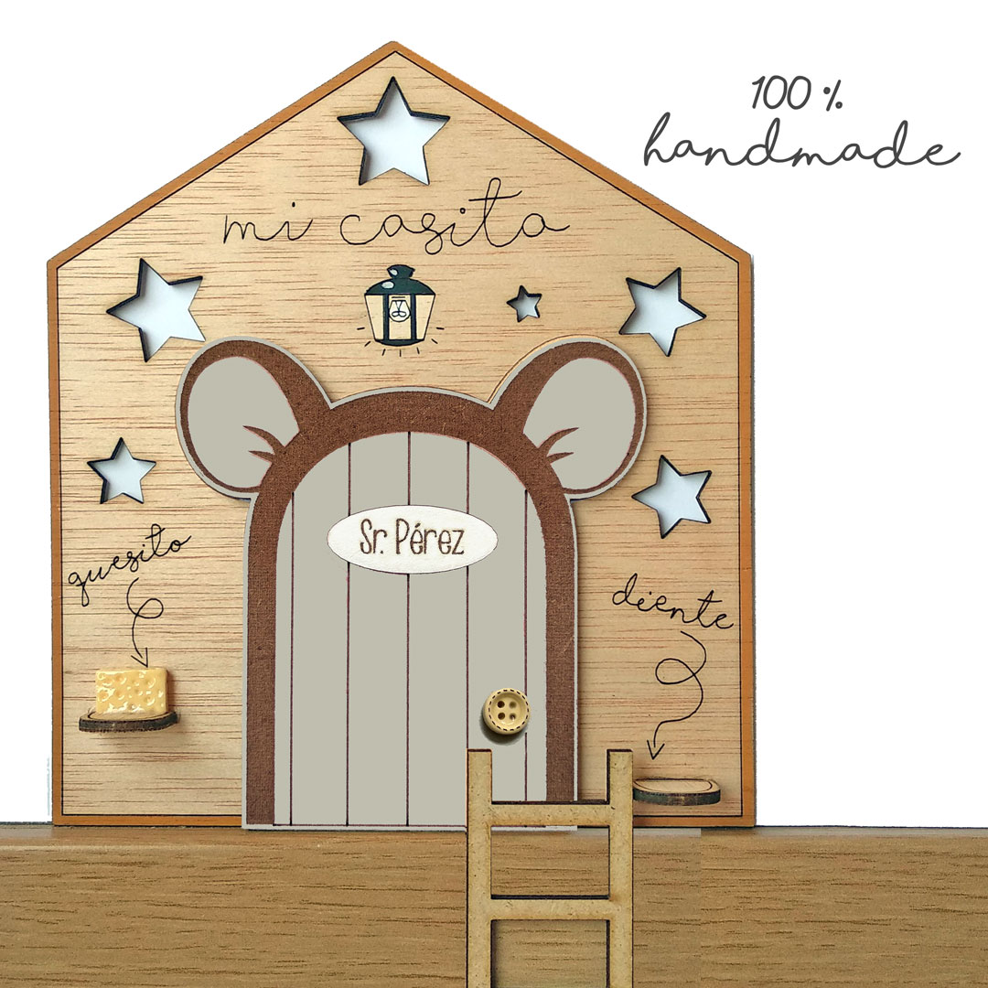 Puerta del Ratoncito Pérez con orejitas de color gris y casita