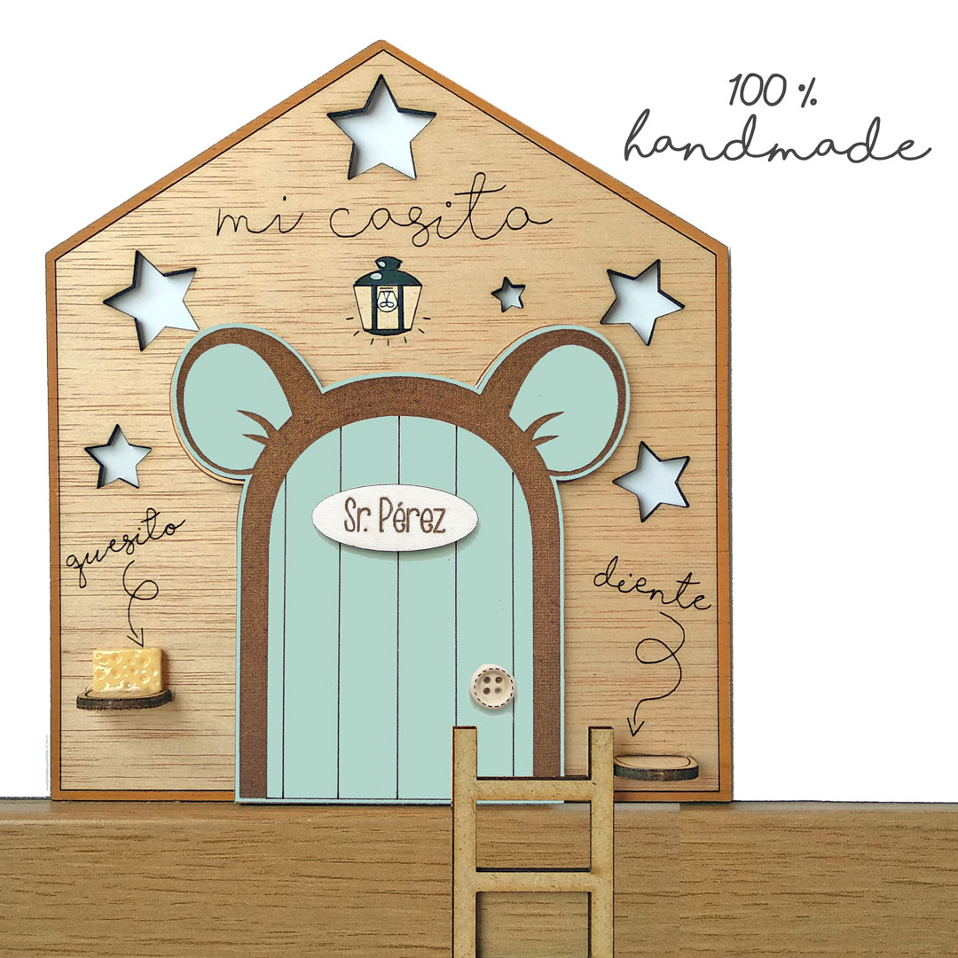 Puerta del Ratoncito Pérez con orejitas de color menta y casita